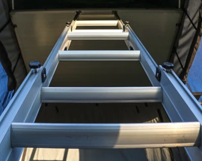 Die breiten Sprossen der an die Fahrzeughöhe anpassbaren Aluminiumleiter gestatten auch eine Barfußnutzung, ohne dass man die Zähne zusammenbeißen muss. Wer einmal eine Leiter mit runden Sprossen barfuß genutzt hat, der weiß genau wovon hier gesprochen wird. Im Bedarfsfall kann die Leiter mit einer optional erhältlichen Verlängerung auch an Fahrzeuge mit einer Montagehöhe von mehr als 2 Metern angepasst werden. Standardmäßig statten wir unsere Schiebeleitern mit separat zu transportierenden Ausgleichsfüßen aus. Die Leiter stellt bei Klappdachzelten ein notwendiges statisches Element dar, lastet sie doch das klappende Bodenelement und alle darauf einwirkenden mechanischen Kräfte ab.